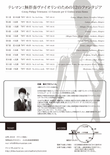 無事終了しました。たくさんのご来場ありがとうございました。 ゲオルク・フィリップ・テレマン:無伴奏ヴァイオリンのための12のファンタジア G.P.Telemann:12 Fantasie per il Violino senza Basso 1. 第1番 変ロ長調 TWV 40:14 (Largo, Allegro, Grave, Si replica l'allegro) 2. 第2番 ト長調 TWV 40:15 (Largo, Allegro, Allegro) 3. 第3番 へ短調 TWV 40:16(Adagio, Presto, Grave-Vivace) 4. 第4番 ニ長調 TWV 40:17 (Vivace, Grave, Allegro) 5. 第5番 イ長調 TWV 40:18 (Allegro-Presto-Allegro-Presto, Andante, Allegro) 6. 第6番 ホ短調 TWV 40:19 (Grave, Presto, Siciliana, Allegro) 7. 第7番 変ホ長調 TWV 40:20 (Dolce, Allegro, Largo, Presto) 8. 第8番 ホ長調 TWV 40:21 (Piacevolmente, Spilituoso, Allegro) 9. 第9番 ロ短調 TWV 40:22 (Siciliana, Vivace, Allegro) 10.第10番 ニ長調 TWV 40:23(Presto, Largo, Allegro) 11.第11番 ヘ長調 TWV 40:24 (Un poco vivace, Soave, Da capo un poco vivace, Allegro) 12.第12番 イ短調 TWV 40:25 (Moderato, Vivace, Presto) 佐藤駿太(ヴァイオリン)